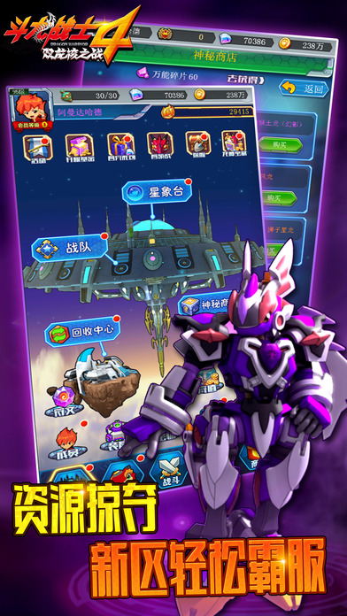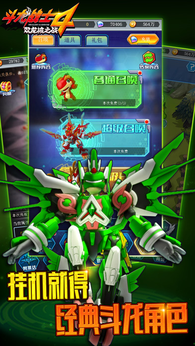 《斗龙战士4双龙核之战》 是以时下流行的国产动画大作《斗龙战士4双龙核》为题材,该游戏成功地带入了原动画中的流行元素,贴合原动画剧情发展,大大增加了原动画爱好者的成功带入可能,还可以任意使用主角宝贝龙与敌厮杀,各个角色拥有专属技能,还有可爱的原画中配角宝贝龙们以宠物的方式帮助玩家们更好的过关。 游戏特色 挂机——玩家可以使用解锁后的角色通过点击进行战斗,玩家不点击则进入挂机模式,同样可以获得经验、金币等游戏道具,挂机时间越长产生的道具越多; 养成——解锁后的角色,要通过升级本身和升级技能还有通过双龙核来强化,达到快速通关的目的; 收集——收集强力可爱的宝贝龙宠物们,可以更好地强化人物属性; 排行榜——收集、养成及挑战过后最关注的还是好友们的战况。