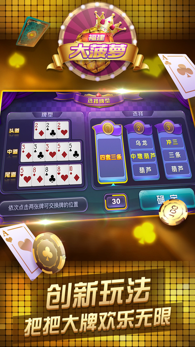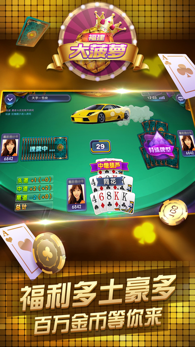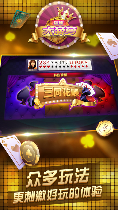 十三水好玩又好赢,花了2年研发的游戏秒杀其他游戏! 2017hi翻天十三水 | 十三水注册赢好礼!!! 最公平的十三水玩法,让您远离作弊烦恼! 全新炫酷界面!更多游戏玩法! 超精简操作布局,按下就变高富帅! 【每日登陆即获奖励】 【本土配音亲切动感】 【玩家个性头像展示】 【多种表情道具畅玩】 【多种房间多种选择】 【十三水游戏介绍】 十三水亦称罗宋,明牌十三水,流行于福建等地,其规则是将一副牌52张均给四位玩家,每位玩家将13张牌分成三副,其中头墩3张,中墩5张,底墩5张,称为前、中、后墩,之后与其它三家比牌型、牌面。较大则为赢一墩。不同的特殊牌型则有额外的墩数计算。 【十三水活动介绍】 新手好礼,天天送奖每天登陆就有奖,还有神秘宝箱奉送,游戏币送不停,一天更比一天多,越送越给力! 无需注册,即可游戏一键登陆游戏,不用注册账号,即可轻松体验游戏乐趣! 比赛房间,极致激烈的竞技比赛,还有实物奖励赠送,不服气?比牌技?比赛专区,来挑战吧! 慷慨解囊,一掷千金游戏内嵌的游戏币赠送系统,都能让您尽显一代王者风范,让你享受一掷千金的快感! 传扬天下,举世闻名游戏里设有喇叭广播系统,精美实物礼品赠送,任务成就,体现你的战绩辉煌,更可借此邀战四方,成就无上威名!