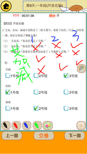 天天奥数栏目每日试题由奥数名师精选、解析,以保证试题质量。 根据试题知识点类型匹配难度,中难度试题适合一些有过思维基础训练、考题学习经历,并且数学成绩中上的学生。高难度试题立足于杯赛真题、综合应用和加深各知识点,适合一些志在竞赛中夺取佳绩的学生。 小学一年级右脑数学精选知识点精选、解析:摸彩球; 小学一年级右脑数学精选知识点精选、解析:求正确结果; 小学一年级右脑数学精选知识点精选、解析:几种走法; 小学一年级右脑数学精选知识点精选、解析:开发右脑; 小学一年级右脑数学精选知识点精选、解析:蜗牛爬井; 小学一年级右脑数学精选知识点精选、解析:巧算加减; 小学一年级右脑数学精…