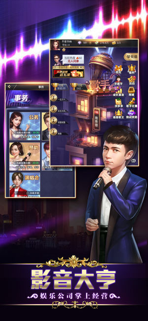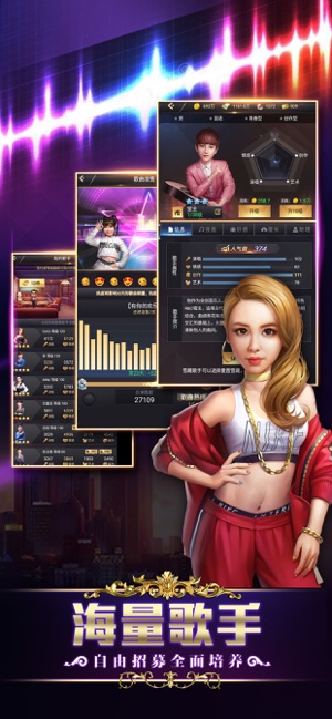 【立志打造,最强音乐经纪公司】 化身音乐经纪人,立志打造全国最强音乐经纪王国。 【模拟经营,销量人气节节攀升】 模拟制作多种风格唱片,冲刺殿堂销量,角逐十大金曲榜。 【录制唱片,殿堂金曲横扫榜单】 跟紧市场流行走势,与其他玩家分组比拼销量排行。 【巡回演唱,群星加盟火热爆棚】 群星开场,全国各地火热巡演,赢取海量金币收入。 【综艺节目,最强歌王巅峰角逐】 每周七首新曲,跨服竞技,谁是冠军?