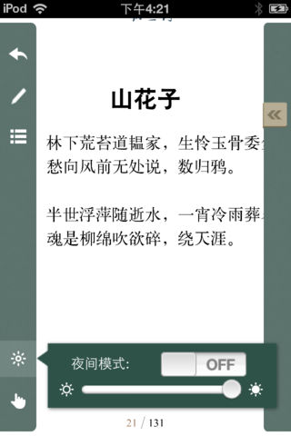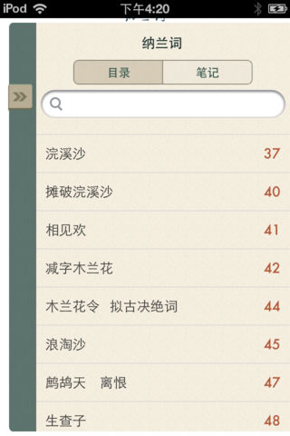 **更多古典图书,请搜索“古典书城”。** 《纳兰词》(简繁体版),适合iPhone、iPad下载阅读。 纳兰性德(1655-1685年):为武英殿大学士明珠长子,原名成德,字容若,号楞伽山人,满族,满洲正黄旗,清初著名词人。 性德少聪颖,读书过目即能成诵,继承满人习武传统,精于骑射。在书法、绘画、音乐方面均有一定造诣。康熙十五年进士,授三等侍卫,寻晋一等,武官正三品。 妻两广总督卢兴祖之女卢氏,赐淑人,诰赠一品夫人,婚后三年,妻子亡故,吴江叶元礼亲为之撰墓志铭,继娶官氏,赐淑人。妾颜氏,后纳江南沈宛,著有《选梦词》“风韵不减夫婿”,亡佚。纳兰性德死时,年仅三十一岁,“文人祚薄,哀动天地”葬于京西皂荚屯。有三子四女。一女嫁与骁将年羹尧。 纳兰性德与朱彝尊、陈维崧、顾贞观、姜宸英、严绳孙等汉族名士交游,从一定程度上为清廷笼络住一批汉族知识分子。一生著作颇丰:《通志堂集》二十卷、《渌水亭杂识》四卷,《词林正略》;辑《大易集义粹言》八十卷,《陈氏礼记说补正》三十八卷;编选《近词初集》、《名家绝句钞》、《全唐诗选》等书,笔力惊人。 纳兰性德以词闻名,现存349首,哀感顽艳,有南唐后主遗风,悼亡词情真意切,痛彻肺腑,令人不忍卒读,王国维有评:北宋以来,一人而已。 朱祖谋云:八百年来无此作者 ,潭献云以成容若之贵……,而作词皆幽艳哀断,所谓别有怀抱者也,当时盛传,“家家争唱饮水词,纳兰心事几人知”。《纳兰词》传至国外,朝鲜人谓“谁料晓风残月后,而今重见柳屯田”。 纳兰词初名《侧帽》,后名《饮水》,现统称纳兰词。 · 此程序提供简繁体两个版本 功能: · 自动记录最后阅读位置功能 · 可添加书签功能 · 屏幕点触控制翻页效果 · 仿古的编排设计 使用说明: - 点触屏幕上方显现、隐藏选项 - 点触屏幕下方左区去上一页 - 点触屏幕下方右区去下一页 **联系我们: 新浪微博:weibo.com/gudianshucheng 腾讯微博:t.qq.com/gudianshucheng 微信:gudianshucheng 邮件反馈:gudianshucheng@feetan.cn **更多飞螳科技资讯,请登录www.feetan.com ***************************************** 更多飞螳产品,请搜索“fee tan” 或“飞螳” -生活实用图书《食物相克》位列《信息参考》第3名-0.99 -连续4个月排在书籍前十的《女生不能看的漫画》0.99 -《唐诗宋词元曲三百首》简繁体6本书,仅售1.99 -《古典名著合集》合集60本,仅售2.99 -《二十四史》仅售2.99 *****************************************