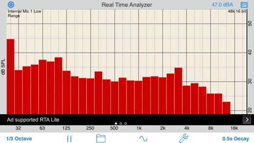 Real Time Analyzer for iPhone. Now you can have an accurate and powerful Real Time Analyzer (RTA) for free on your iPhone or iPod touch. This is the free ad-supported and feature-limited version of our popular and highly rated Studio Six Digital RTA app. It includes 1/3 octave mode and iPhone mic compensation. Unlock this app by in-app purchase to remove ads and to get the same app as our full-featured RTA that is part of the AudioTools suite of apps, including 1/3 octave mode, a range of decay options, Peak Hold, Average Mode, Overlay Curves, Cursor Readout, Save/Recall, and much more! Using ANSI type 1 or better filters, this RTA is very accurate, even in this lite version, since it uses the engine from our full version. Use it to check your sound system, monitor audio, and adjust your car audio system. Try this out, and if you like it you can always upgrade to our full RTA version, or to AudioTools, which includes the full RTA and a lot more. Check out iAudioInterface, our professional-audio test and measurement microphone, line input, and line output accessory made for iPod touch. New! iTestMic is a direct plug-in test & measurement mic that has full pro specs. The full version of RTA, and the version in AudioTools, is ad-free and adds Pink Noise generation, graph zooming, dB/frequency cursor, Max/Min bars, noise curve overlays, Save and Recall of graphs, external mic support, overall SPL A&C dB readout, and decay options including slower decay, and peak hold and average modes, and lots more. *** iPhone mic Frequency Compensation Filter RTA uses a special frequency-compensation filter to flatten the iPhone mic. RTA is designed by the same team that built the Audio Toolbox acoustic analyzer. *** Specifications and Devices The internal iPhone mic has a noise floor near 30 dB, and clips around 105 dB. So, be aware that this tool will NOT work in very loud environments, such as clubs or some concerts.