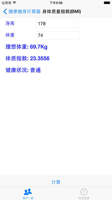 这是一个帮您进行健康管理和制定健身计划的应用. AOBO推出的其他和健康有关的系列应用还有: 酒量.烟量计算器 脚底按摩指南 药食同源:健康食品85种 使用方法: 一)从一般用户进入计算菜单的话,即输入数据, 按计算按钮即可. 二)在用户一览画面,按(+)按钮后,设置用户信息后,从该用户进入计算菜单后,就可以利用日志功能了。虽然对用户的个数没有限制,但考虑到性能,最好在20人以下。 三)您可以追加或删除用户,但您不能删除或编辑日志信息,除非您删除此用户。 功能特征: 1,可以计算和测定在健康管理和健身计划中所必须的数据. 1) 基本代谢率(具有日志功能) 2) 身体的表面积(具有日志功能) 3) 人所必需和蒸发的水分(具有日志功能) 4) 健身的最佳心率 5) 根据心率推算寿命 6) 身体质量指数(BMI)(具有日志功能) 7) 肺活量 8) 各种运动消耗的卡路里(具有日志功能) 9) 健身的目标心率 10) 血压是否正常(具有日志功能) 11) 体脂肪的百分比(具有日志功能) 12) 减少体脂肪的目标设定 13) 隐性肥胖的判别(具有日志功能) 14) 肥胖类型的判别(具有日志功能) 15) 少儿肥胖的判别(具有日志功能) 2,所有的计算日志都用图形显示,可以对您的身体的各种信息的变化一目了然。 3, 此应用在开发过程中主要参照了下列日本政府和健康管理研究机关的数据和材料 日本高血压协会 国立循环器官疾病中心 日本卫生部 国立健康营养研究所 日本肥胖学会 4, 支持语言: 汉语,英语,日语 5, 免责事项 本应用不负责计算结果给您带来的任何影响.