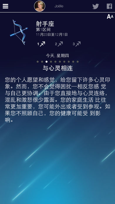 *** Application available in multiple languages (English, Deutsch, Español, Français, Italiano, 日本語, 中文, Русский,العربية, Português, Dansk, עברית, 한국어, Nederlands, Norsk, Polski, Svenska, Türkçe, Ελληνικά) *** 阅读您的每日星座运势,内容由 12 年以上工作经验的天文专家提供。 - 所有的星座和其 3 个十度区间 - 每次启动并不下载内容,仅在需要时下载 - 更新在实时进行 - 逼真的 iPhone 优化界面:简单又快速 - 年度星座 白羊座, 金牛座, 双子座 , 巨蟹座, 狮子座, 处女座, 天秤座, 天蝎座, 射手座, 摩羯座, 宝瓶座, 双鱼座 申请无广告!