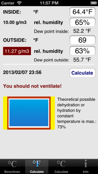 Das Programm VentilateClever wurde unter iOS 5.1 entwickelt und mit iPhone und iPad getestet. Messgerät für Temperatur und Luftfeuchtigkeit Beachten Sie, dass für die Nutzung dieses Programmes ein Messgerät nötig ist, welches die Temperatur und die Luftfeuchtigkeit jeweils im Gebäude und ausserhalb messen kann. Ideal ist ein Gerät mit einem via Funk verbundenen Aussensensor, der sich geschützt vor Regen im Schatten befindet. Die Messgenauigkeit sinkt bei sehr hohen Luftfeuchtigkeitswerten. Manchmal differieren Innen- und Aussensensor selbst unter exakt den gleichen Bedingungen. Daher empfiehlt es sich, die Werte auf- bzw. abzurunden. Das Programm berechnet die Luftfeuchtigkeit zwar auch für die erste Dezimale der Temperatur durch eine Annäherung recht genau, doch lassen Sie sich dadurch nicht täuschen. Die Messtoleranz Ihres Gerätes ist wahrscheinlich höher als ± 1% Luftfeuchtigkeit. Die Messgenauigkeit bei der Temperaturmesseung dürfte hingegen ± 0.2 °C betragen. Temperaturbereich Mit dem Programm lässt sich aus der relativen Luftfeuchtigkeit für den Temperaturbereich von -10°C bis 35 °C berechnen. Das dürfte die Bedürfnisse der meisten Anwender abdecken. Das Programm führt die Berechnung auch in °Fahrenheit durch. Die Bedienung erfolgt dann in englischer Sprache. Taupunkt Seit Version 2.0 wird für innen und aussen je der Taupunkt berechnet. Das ist jene Temperatur, bei der Kondensation eintritt. Die Werte sind mit Hilfe einer Annäherungsformel berechnet, die sowohl über 0°C als auch unter 0°C eine Abweichung von ledilgich ± 0.1°C ergeben. Es hat übrigens bei der Messgenauigkeit der Geräte keinen Sinn, zwei Dezimalstellen anzugeben. Es wird empfohlen auf die ganzzahlige Temperatur aufzurunden. Dann ist man auf der sicheren Seite. Es wird empfohlen, Malarbeiten mindestens drei Grad über dem Taupunkt auszuführen. Hauptanwendungsbereich: historische Gebäude, Kirchen etc. Die hier empfohlene Vorgehensweise hat sich vor allem bei historischen Gebäuden, z.B. Kirchen mit dicken Mauern bewährt. Die Raumtemperatur bleibt durch das Mauerwerk auch beim Lüften relativ stabil, so dass der durch die Applikation berechnete Entfeuchtungseffekt bis zu einem gewissen Grad erreicht werden kann. Holzhäuser haben hingegen eine andere Charakteristik. Sie passen sich der Umgebungstemperatur viel schneller an. Hier ist es wichtig, mit Hilfe dieses Programmes Erfahrungen zu sammeln und diese beim Lüften zu berücksichtigen. Jedes Gebäude hat eine eigene Charakteristik und kann je nach der Beschaffenheit des Mobiliars, der Böden und der Decken in gewissem Mass Feuchtigkeit speichern und wieder abgeben. Nach dem Lüften kann sich die Luftfeuchtigkeit dadurch wieder leicht erhöhen. Was sonst noch zu beachten ist Beachten Sie auch, dass bei einer grossen Temperaturdifferenz, z.B. im Winter aus Energiespargründen nur kurz gelüftet werden sollte. Während im Winter die Luftfeuchtigkeit innen eher zu gering ist, ist sie im Sommer eher zu hoch. Anzustreben ist ein Bereich von 50 bis maximal 70% relative Luftfeuchtigkeit. Nicht immer lässt sich die Luftfeuchtigkeit allein durch Lüften im gewünschten Bereich halten. In gut geheizten Räumen kann im Winter oft eine rel. Luftfeuchtigkeit von 50% nur mit einem Luftbefeuchter erzielt werden. Umgekehrt ist es im Sommer bei längeren Regenperioden nötig, einen Entfeuchter einzusetzen, um nicht über 70% zu kommen. Wird allerdings clever gelüftet, kann bei grossen Gebäuden oft durch 30 min. intensives Lüften ein grösserer Effekt erzielt werden, als durch den stundenlangen Betrieb eines Entfeuchters. Ab 70% Luftfeuchtigkeit kann sich Schimmel bilden. Am Schädlichsten sind jene Situationen, bei denen warme Luft an kalten Wänden Kondensate bildet. Das ist der Fall, wenn die Temperatur der Wand der Taupunkttemperatur entspricht oder sie unterschreitet. Das Programm weist Sie u.U. auf entsprechende Gefahren hin.