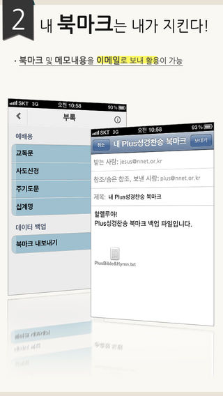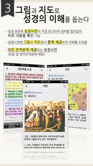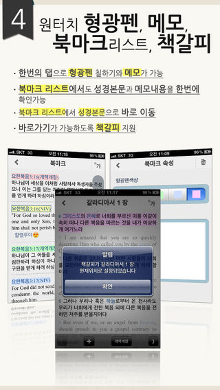 성경검색 사이트 1위'인 홀리넷(holybible.or.kr)에서 제공하는 성경검색 서비스를 아이폰에 최적화한 가볍고 알찬 성경!!! * 포함된 내용 1) 성 경 : 개역개정,개역한글,표준새번역,공동번역,NIV,KJV,NASB 2) 찬송가 : 통일찬송가 558곡 가사 3) 부록 : 교독문, 사도신경, 주기도문, 십계명 * 주요 특장점 + 가볍다!! 그러나 알차다!! ① 홀리바이블 사이트에 접속하여 성경,찬송가 읽기 ② 어플 용량을 거의 차지하지 않아 부담없음 ③ 홀리바이블(holybible.or.kr)에서 제공하는 4개 한글성경 번역본, 3개 영어성경 번역본 및 통일찬송가 가사를 모두 읽을 수 있음 + 내 북마크는 내가 지킨다. ① 북마크 및 메모 내용을 이메일로 보내 활용이 가능 + 깔끔하고 단아한 디자인 ① 미니멀한 디자인으로 심플하고 단아한 느낌의 성경어플 ② 파스텔톤의 컬러와 형광펜 색상이 마음을 차분하도록 도와줌 + 그림과 지도로 성경의 이해를 돕는다 ① 성경 본문에 성경사전이 직접 링크되어 검색할 필요없이 바로 내용을 확인 가능 ② 성경사전에 그림과 지도등이 함께 제공되어 이해를 도와줌 ③ 모든 번역본에 제공되는 성경사전(한글 및 영어번역본에 해당) + 원터치 형광펜, 메모, 북마크리스트, 책갈피 ① 한번의 탭으로 형광펜 칠하기와 메모가 가능 ② 북마크 리스트에서도 성경본문과 메모내용을 한번에 확인가능 ③ 북마크 리스트에서 성경본문으로 바로 이동 ④ 바로가기가 가능하도록 책갈피 지원 + 성경검색도 내 마음대로 ① 번역본별, 책별 설정으로 성경검색범위 설정가능 ② 한페이지에 10개씩 출력하여 속도가 빠름 + 빠른 찬송가 찾기와 간편한 가사보기 ① 장 숫자로 빠르게 찾기 ② 절별, 후렴을 따로 정리한 가사보기 + 완벽한 부록 구성 ① 교독문, 주기도문, 사도신경, 십계명을 수록 ② 성경, 찬송 합본으로 손색없음 * 포함된 번역본 : -개역개정 -개역한글 -공동번역 -표준새번역 -NIV -KJV -NASB -통일찬송가 * 주요기능 : -번역별 대역보기(영한대역) -번역별 성경본문 검색(검색범위 자유설정) -책갈피 -북마크 -하이라이트 (5가지 색상) -메모 -폰트조절 -성경용어사전(한/영) -북마크내보내기 -교독문,주기도문,사도신경,십계명 지원 * 저작권에 대한 고지 1. 성경전서 개역개정판, 개역한글판, 표준새번역, 공동번역의 저작권은 (재)대한성서공회에, 2. NIV는 Biblica에, 3. The Hymnal Society of Korea IF, 2010