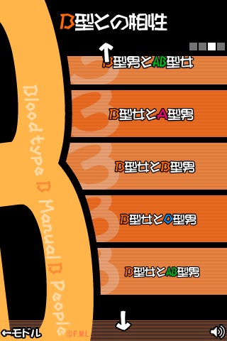 ★★★★★★★★★★★★★★★★★★★★ ライフスタイルカテゴリ ベスト4独占!! 総合トップ50に全血液型同時ランクイン! (8/14-8/18) AppStoreおすすめ[NEW]に掲載!(8/13-8/27) ☆☆累計2万5千ダウンロード突破!!☆☆ セール期間を延長のまま(230円が115円!) 鑑定結果ボリュームUP!ぜひこの機会に! ★★★★★★★★★★★★★★★★★★★★ 自由奔放で超マイペース。だけど実はナイーブ?そんなB型人間の本性が分かっちゃう!? 基本的な行動と考え方から恋愛まで項目別に細かく分析されているので自分でも気づかない意外な一面がわかるかも。 また、各血液型との相性やエッチの傾向まで気になるB型さんホンネを知りたいアナタにも必須マニュアルです! ●基本的な行動と考え方 B型のかいせつ 変わり者になりたい願望? 天邪鬼なB型の言動 B型特有の人との接し方 B型が物事を決めるとき B型のショッピング徹底解明 B型の話術 自分からみた自分 B型が好きになるもの B型の集中力 ●B型の恋愛 恋愛相談とかするの? B型メール術 B型が好きな異性のタイプ B型が結婚を決意するタイミング B型は未練が残るってホント? 燃えたぎるB型の恋とは・・・ B型のセックス観 ●B型を知る 浮気?それとも本気 B型、本当のトコロ B型のキレ方 B型の行動パターン 細かく言われるのが大嫌い。B型の本質 ●B型との相性 B型男とA型女 B型男とB型女 B型男とO型女 B型男とAB型女 B型女とA型男 B型女とB型男 B型女とO型男 B型女とAB型男 ●B型の落とし方 B型女のシンデレラ願望 自分では駆け引き上手のつもりのB型男 軽くて淡白。でもアブノーマルなB型 B型は、本当は振り回されたい!? 誉めどころを掴んだら、B型は落ちる! ★鑑定士プロフィール F.M.L※female media laboratory 占い/心理・美容・健康コンテンツを中心とした女性向けのコンテンツを多数手がける集団。 多数のクリエーターが所属している為提供しているコンテンツは多岐にわたる。 【実績】 通信キャリア公式占いサイト監修 通信キャリア公式女性の医学サイト監修(一部のみ) 通信キャリア公式お悩み相談サイト監修(一部のみ) その他診断,心理テスト,コラム,Q&A製作等多数 その他多数