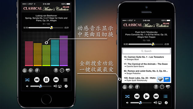 * 全球排行第一的古典音乐类应用! * 最新 iOS 以及 iPhone /iPad 优化! * 苹果应用商店以及美国纽约时报大力推荐的经典音乐软件 * 中英文对照,音频展视器,维基/百度百科切换,优酷/YouTube视频,收藏夹,计时器,及触屏控制等更多功能! "音乐,使男人激情燃烧,女人潸然泪下。" —— 贝多芬 "太喜欢了,每天和家人一起分享,以前许多旋律熟悉叫不上名字的歌曲也知道了名字,品位人士的首选!" —— 加菲大王 "音乐经典优美,令常常在下班路上疲惫的我得到休息,陶醉忘我!期待有不断升级,增加曲目,谢谢!" —— 丸仔 "iPhone上软件来来去去,这个始终保留着。曲目…