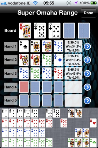 Have you ever been annoyed by the inaccurate results for the Omaha odds calculators in app store? Are you still looking for a reliable and serious app for your Omaha game? Do you even want something powerful as very popular pokerstove does on Hold’em? Now here it comes: Super Omaha Range, the most advanced and powerful Omaha calculator in the app store, for both Omaha and Omaha Hi/Lo! It is the only one that let you assign hands by specific cards, hand ranges or percentage slider. And you can even assign any number of cards in your hand(other cards are left random). Besides, you can get the information about hand types and equity breakdowns. The popular and useful features “deal to” is also available. By this, you can check the odds on every street. What’s more, there is a top hand checker, with which you can check how good is your starting hand, and which place it is in for both straight high and Hi/Lo game. With Hi/Lo, you can also using the Hutchinson Point System to evaluate your starting hands. And some usual features like dead cards setting and displaying by both percentage and ratio are included as well. Overall, this is the only app you need for Omaha(and Hi/lo of course). You can't head for a card room without it. And if you like it, please check the hold'em version: Super Poker Range. Features: -Calculate odds and equities for both Omaha and Omaha Hi/Lo games -Assign any number of cards in your hand (other cards are left random) -Assign hands by specific cards, a hand range or a percentage -Advanced optimistic algorithm offering high efficiency and accuracy -Full hand type and equity breakdown chart -Double direction hands sliders and separate ranges for different suit filters -Top hand checker for both Hi and Hi/Lo hands -Exclusive Hutchinson Point System Calculator -Deal to feature, let you check the odds on every single street -Multiple hands calculation, adding players as you want -Both percentage and ratio display -Dead cards setting -iOS 5 compatibility