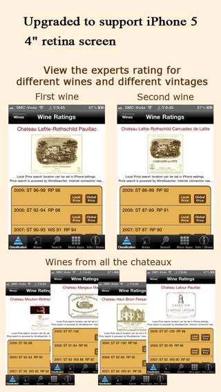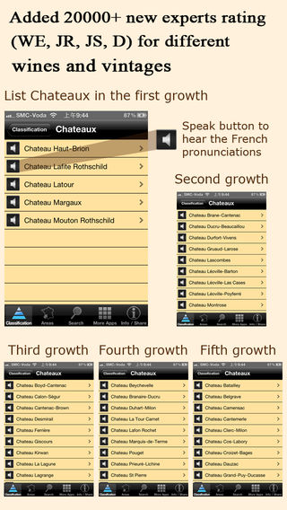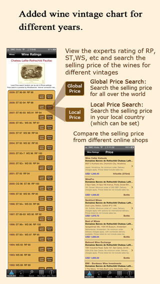 波尔多葡萄酒大全 提供了最完整的波尔多红酒专家评分,如拉菲酒庄(Chateau Lafite),拉图酒庄(Chateau Latour)生产的佳酿等,是您的葡萄酒最佳购买指南。 本大全提供了各专家(RP,WS,ST,CG)對每一支波尔多葡萄酒每一个年份的评级。 本大全以梅多克区,圣达美隆区,格雷夫斯区和索泰尔纳区的各区评级为分类,及以不同的波尔多地区如波亚克,玛歌,波美侯等为分类,您可以很容易地找到您需要寻找葡萄酒。 波尔多葡萄酒大全有: 500+ 酒庄 5000+ 葡萄酒 30000+ 评级 没有网络连接的需要!所有资料都嵌入了程序本身。 您可以于任何时间,任何地方使用本应用程序!! 即将推出: 勃艮第葡萄酒评分大全(及罗讷河区) 意大利葡萄酒评分大全