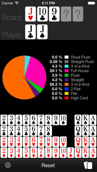 Easy to use odds calculator for Texas Hold'em. Just drag and drop cards into place! Supports two modes of operation: 1. Player vs. Opponents 2. Hand Rankings (pie chart) Key features: 1. Calculates equity probability of each player. 2. Color to indicate strength: red (weak) to green (strong) 3. Calculates probability of a Royal Flush, Straight Flush, 4 of a kind, Full House, Flush, Straight, 3 of kind, 2 pair, pair and high card. 4. Supports up to 10 players in player vs opponents mode. 5. INTERNET CONNECTION IS NOT NEEDED. 6. four color suits option. Advanced Features: (turn on advanced features in settings) 1. Deal to pre-flop, flop, turn, or river. 2. Fold players (press and hold player) 3. win and tie percentages (tap player) If you like this app, try Poker Odds Pro, which includes hand ranges and more.