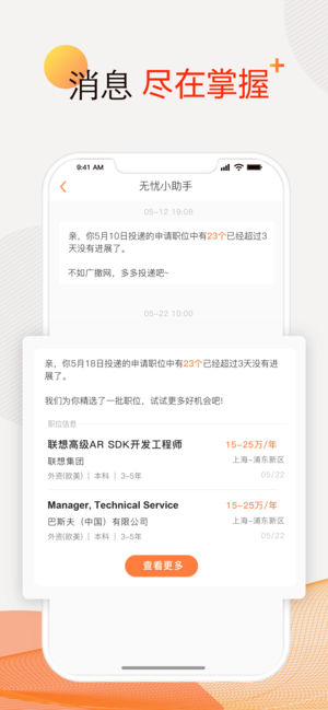 前程无忧51Job,中国互联网百强企业,2004年美国纳斯达克上市。 许多知名公司、世界500强企业都在51Job招聘人才、发布职位。丰富的职位信息覆盖了各个行业、各个岗位,给求职者提供了更多的选择,每周有超过5,000万份简历通过51Job发送到招聘企业。 互联网、金融、房产、汽车、快消……各行业大咖都在这里抢夺人才。 销售、财务、技术、客服、产品……各岗位的求职者都在前程无忧投递简历。 更多的企业选择在前程无忧招聘人才,更高效的找到想要的人才。 更多的求职者选择前程无忧求职,找到了更好福利、更高薪资的工作。 【职位发现】职位太多懒得看?轻戳,适合你的工作都在这儿 【职位搜索】支持附近查找…