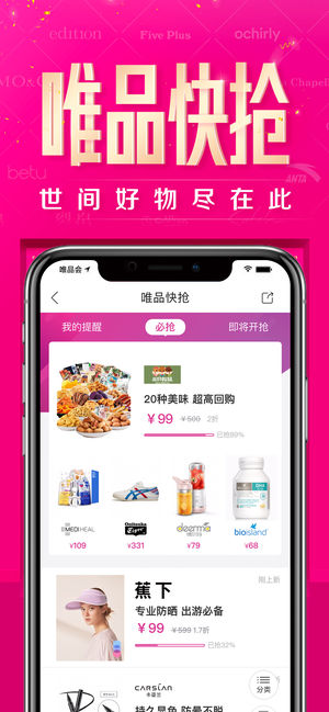 唯品会,品牌特卖! 数千名专业买手精选好货,品牌特卖,有了唯品会,从此再也不用担心买不起正品大牌啦! 1、深度折扣 限时特卖 品类齐全 每天早10点&晚8点上新品 全场大牌深度折扣,全网最实惠 服饰、美妆、母婴、居家多种品类,满足您的一站式购物需求 2、购物体验有保障 支持货到付款,先看实物再给钱 七天无条件退货,退货返10元唯品币 3、全球知名特卖电商,美国上市公司 品牌直签授权,从根源杜绝假货,百分百正品保障 4、八成用户成为回头客 每天帮助3亿会员节省数亿元,享受“尊贵不贵” 超过85%的会员买了又买,日日约会 5、唯品快抢 每天惊喜抢购 裸价到底、没有套路,准点更新…