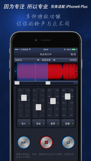 发布七年来第一次免费,第一次限免!!! App Store六大之最铃声软件! 我们的目标是做最专业、功能最强大、用户体验最好的铃声软件!一句话就是行业第一! 一、技术最先进、功能最强大的铃声软件 1.铃声在线试听,边试听边下载同步进行。这样做的好处是当网速不好的时候用户不用等待下载完整首铃声之后才能试听。 2.编辑铃声时支持多种特效:淡入淡出,男女声互变(变调),变速。大大增加铃声的趣味性。最重要的是这些特效可以实时动态调整(边播放边调整),不用每次重新播放,这个技术目前在app store上没有人可以超越。 二、下载量最大的铃声软件 手机铃声是app store铃声类软件中最受欢迎的Ap…