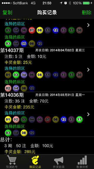 新版本已适配IOS 10。 祝贺日本彩民しゃぼん于12年3月19号使用我公司出品的ロト6プロ屋软件喜中1等奖,奖金额为217,597,800日元(约1700万人民币)。详情见产品博客。 Farmer Tech系列产品--双色球宝典Pro,工具畅销榜第二名 本软件是体彩超级大乐透的辅助工具, 集超级大乐透开奖数据分析、筛选、缩水, 历史开奖结果查询, 自行更新开奖号码, 自动兑奖等多种功能为一体的智能化彩票软件。软件原理基于“旋转矩阵”, 这一方法曾在美国造就了74位大奖得主, 是彩票业主流的预测缩水算法。本软件作者为日本LOTTO 6资深彩民, 已在美国、欧洲、日本彩票界帮助近百万彩民用户斩获颇丰。 ◆请注意:本软件不含推荐选号,仅提供4保4,5保3和排列缩水功能。4保4,5保3,4保4,4保3,3保3和推荐选号功能,遗漏值计算功能,仅在《大乐透Pro》里提供。 软件亮点: ■下一期中奖号码的预测. ■利用旋转矩阵算法帮助彩民缩水,减少垃圾投注。 ■最新中奖结果及中奖金额的更新等(数据在开奖日当天21:00分左右更新)。 ■购买记录管理,自动计算每期的中奖金额。 ■支持追加投注的奖金计算。 ■各种数据分析,分析结果均可通过邮件进行发送,发送的结果可以直接导入Excel,方便彩民的进一步分析。 ■预测结果邮件中,附件是淘宝下单用的上传文件,方便彩民进行网上投注。 ■支持模拟投注。可以利用我们的软件进行模拟投注,通过历史记录长期跟踪你的自选号码的中奖情况。 ■为了用户便于区分,软件采用了七种不同颜色来区分5红2蓝。 功能简介: 1、彩票号码的选择及购买列表的生成。 1)通过点击画面手动进行号码选择。 2)通过软件自动选择号码。 在高级版本产品《大乐透Pro》里,我们提供推荐选号的功能。通过对历史开奖结果进行分析和验证, 采用特殊的计算方法排序进行选择。 3)根据购买记录来选择号码。 4)根据数据统计信息表,通过自己的判断来选择预测号码。 5)利用旋转矩阵算法帮助彩民缩水,有2种缩水类型可供选择:4保4,5保3。 注:在高级版本产品《大乐透Pro》里,提供6种缩水类型可供选择。 5保4,5保3,4保4,4保3,3保3 缩水例:选择11个备选号码时,5/5:462注(原始组合)、5保4:22注、5保3:5注,个人推荐 5保4 或 5保3型缩水。 6)预测结果的保存及邮件的发送。 2 、购买记录的管理。 开奖后中奖金额的自动计算。 对购买次数、购买金额及中奖金额进行统计。 3、历史开奖结果查询。 4、数据统计 ◎ 期别出现次数顺序表 ◎ 期别出现次数表 ◎ 数字别出现的次数及顺序表 ◎ 低高和差数表 ◎ 奇偶数倾向表 ◎ 3、5、7、10、11、13分割倾向表示 注意事项 1、当历史开奖结果更新失败或是有错误数据发生时,请删除并重新更新。 2、如对本软件有任何宝贵意见和建议,欢迎您与FarmerTechs@Gmail.com联系! 售后QQ:2311079125。 3、本软件仅供使用者参考,因利用本应用程序购买彩票所带来的一切损失及其他后果均由使用者本人承担。