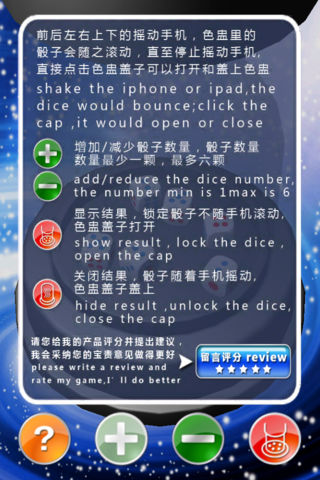 目前为止商店里最真实超仿真3d骰子,采用全新的三维技术,操作简单易用,完全模拟真实的色盅和骰子,只需摇动手机,里面的仿真骰子就会在仿真色盅里滚动,摇得越猛烈骰子滚动越厉害,停止摇动手机骰子也停止下来,该三维骰子具备以下功能: 1.通过识别手机摇动来滚动骰子,和真实摇色盅的感受一致 2.骰子的数量可以随自己需要增减,最少1颗,最多6颗 3.色盅的盖子可以盖下,摇完后开盖,增添更多乐趣 4.在摇完之后,可以统计骰子的最终结果并锁定手机 该3d骰子便于携带,非常适合夜店酒吧ktv喝酒玩吹牛大话、比大小等色盅骰子游戏使用,不再为需要时找不到色盅骰子而扫兴。 该3D骰子将不断更新推出新功能, 致力于成为商店里最好用最真实的骰子游戏, 今后的更新将加入朋友间手机组团联网对战, 互联网联网对战…………等的让人兴奋的新功能, 敬请期待!, 各位玩家如有任何对于该游戏的意见都欢迎提出,本人将尽可能的的满足各位的需求,以答谢各位的支持! 最新1.2版更新特性: 1.全新摇动算法,完全解决叠子问题无重复,无抖动,摇起来更顺手 2.加入统计结果功能 3.加大骰子和色盅 4.统计结果时禁止加减骰子数量 5.用触摸色盅盖子代替用按钮开关盖子