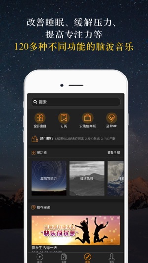 #下载即送3首免费脑波# #首次注册即可享受所有脑波免费体验7天# 中国健康网强烈推荐! 如果您正承受着生活的重压,忍受着身体的亚健康状态,为何不试试一种全新的愈疗方式--通过倾听脑波音乐,与困扰你的健康问题轻松说Bye Bye! 神奇脑波运用脑波传输工作原理,通过收听脑波音乐,让大脑随着脑波音乐的频率刺激转换为与之相似的一种脑波状态。简而言之,通过调节您的脑波频率到某种状态,使您整个人在大脑的支配下处于该种状态下,以达到您收听的目的。 专业性与权威性 与世界顶级脑波技术专家The Unexplainable Store®通力合作,The Unexplainable Store®从2…