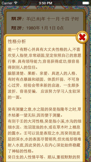 生辰八字,是周易术语四柱的另一种说法。四柱是指人出生的时间、即年、月、日、时。在人用天干和地支各出一字相配合分别来表示年、月、日、时,如甲子年、丙申月、辛丑日、壬寅时等,包含了一个人出生时的天体运行的基本状态。每柱两字,四柱共八字,所以算命又称“测八字”。依照天干、地支沂涵阴阳五行属性之相生、相克的关系,推测人的体咎祸福。 本算命系统来源于中国民俗学的一些测算方法,仅供休闲娱乐,请勿迷信。