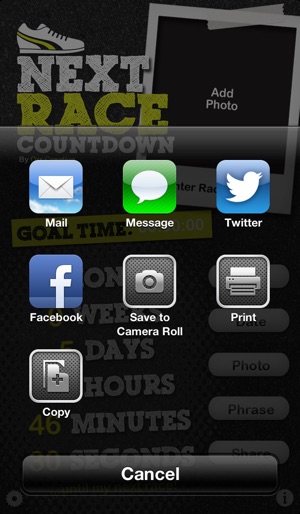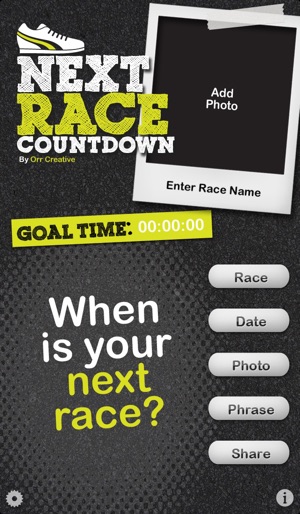 Countdown to your upcoming races with the all new NEXT RACE COUNTDOWN! • Add multiple races *NEW* • Optimized for iPhone 5 *NEW* • Share on Facebook and Twitter • Countdown to your next Marathon/Half-Marathon/10K/5K/etc • Set Goal Time • Designed For Runners • Add a Photo • No Ads…