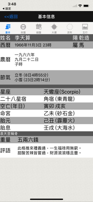 論八字(iCalc8Words)是一個計算八字的算命軟體。根據輸入的西曆或農曆時間, 排出命主的八字資訊, 大運, 小運, 流年, 空亡, 胎息, 胎元, 命宮及五行信息等;細盤功能(四柱, 當前大運, 流年盤);二十八宿信息。, 该版本免除广告。 本軟體主要是提供給對道家和玄學有一定研究或者興趣的人士學習實踐之用。軟體在推出後, 得到東南亞, 香港, 臺灣和中國內地用家的多方面好評, 結果也經過實踐檢驗, 具有一定的準確性, 本著推廣交流的目的, 也希望得到更多用家回饋意見。 軟體主要功能包括: -- 對命例的資料做刪除或者修改; -- 支援夜子時的處理手法及偏好設置; --…