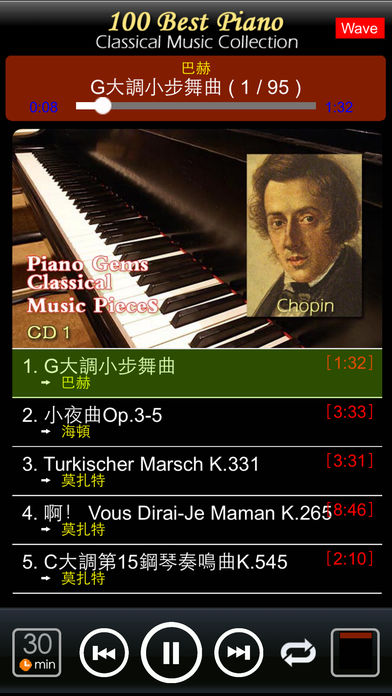 3系列 5CD 100曲,史上最优美钢琴曲,超值珍藏。 ▪ 史上最优美的钢琴精品 ▪ ▪ 40首最经典钢琴曲 ▪ ▪ 理查德·克莱德曼-25年金选 ▪ ◆ ZB Player , 好用才是硬道理,技术创新点: ▪ 同时支持iPhone, iPad,针对屏幕尺寸单独设计 ▪ 数10款皮肤(风格),选你所爱 ▪ 播放列表按照个人喜好排序 ▪ 支持专辑,强大的专辑管理功能 ◆ music list: ▪ 史上最优美的钢琴精品 CD 1 ▪ 巴赫 : G大调小步舞曲 海顿 : 小夜曲Op.3-5 莫扎特 : Turkischer Marsch K.331 莫扎特 : 啊!Vous Dirai-Je, Maman K.265 莫扎特 : C大调第15钢琴奏鸣曲 K.545 贝多芬 : 致爱丽丝 WoO.59 贝多芬 : G大调小步舞曲 贝多芬 : Turkischer Marsch Op.76 韦伯 : 邀请跳舞 舒伯特 : 音乐瞬间Op.94-3 舒伯特 : 即兴曲Op.90-4 门德尔松 : 春歌Op.62-2 肖邦 : D大调雨滴前奏曲Op.28-25 肖邦在C : 幻想曲,即兴夏普小调Op.66 肖邦 : A大调第3波兰舞曲 军队 Op.40-1 肖邦 : D大调第6号圆舞曲 Petit Chien Op.64-1 ▪ 史上最优美的钢琴精品 CD 2 ▪ 肖邦 : E大调练习曲'告别' Op.10-3 肖邦 : E-Flat Major第2号夜曲 舒曼 : Traumerei Op.15-7 舒曼 : Frohlicher Landmann 李斯特 : Liebestraume 李斯特 : La Campanella 勃拉姆斯 : Wiegenlied 勃拉姆斯 : 圆舞曲Op.39-15 芭兰诺芙丝卡 : 少女的祈祷 柴可夫斯基 : 船歌Op.37b-6 柴可夫斯基 : Trokia 德沃夏克 : Humoreske Op.101-7 格里格 : An Den Fruhling Op.43-6 道威尔 : 致野生玫瑰 德彪西 : 月光曲 德彪西 : 盘发的女孩 德彪西 : 水的思考 拉威尔 : Jeux d'eaux 埃尔加 : Salut d'amour ▪ 40首最经典钢琴曲 CD1 40 ▪ 贝多芬 : C小调第14号钢琴奏鸣曲Op.27'月光' 格里格 : 清晨思绪 Peer Gynt Suite No.1 Op.46 德彪西 : 月光曲 Suite bergamasque III 拉威尔 : 孔雀舞曲 舒曼 : 童年Kinderszenen Op.15 VII Traumerei 肖邦 : E大调练习曲Op.10 No.3 'Tristesse' 肖邦 : 降B小调第1号夜曲Op.9 No.1 拉威尔 : Jeux d'eaux 舒伯特 : G大调即兴曲Op.90 D899 No.3 肖邦 : 降E大调第2号夜曲Op.9 No.2 肖邦 : D大调前奏曲Op.28 No.15 '雨滴' 莫扎特 : D大调钢琴奏鸣曲K448 II Andante 肖邦 : 告别圆舞曲A大调华尔兹Op.69 No.1 肖邦 : A 大调练习曲Op.25 No.1'Aeolian Harp' 舒曼 : Albumblatter Op.124 XVI Schlummerlied 莫扎特 : D小调钢琴协奏曲K466 III 快板 肖邦 : G大调 华尔兹 Op.70 No.1 贝多芬 : C小调钢琴奏鸣曲'悲怆'II 如歌的慢板 肖邦 : 升C小调圆舞曲Op.64 No.2 拉赫曼尼诺夫 : D大调前奏曲Op.23 No.4 ▪ 40首最经典钢琴曲 CD2 ▪ 莫扎特 : D小调幻想曲K397 肖邦 : E小调前奏曲Op.28 No.4 圣桑 : 动物狂欢节 VII 七水族馆 肖邦 : A小调圆舞曲Op.34 No.2 格里格 : Holberg Suite Op.40 IV 空气 德彪西 : E大调No.1两个花纹 肖邦 : E小调夜曲Op.72 No.1 拉赫曼尼诺夫 : E小调前奏曲Op.23 贝多芬 : 致爱丽丝 WoO.59 肖邦 : F小调第5号夜曲Op.15 No.2 穆索尔斯基 : 图画展览会 IV 古老的城堡 肖邦 : B小调第10号圆舞曲Op.69 No.2 舒曼 : Waldszenen Op.82 VII 先知 德彪西 : 儿童天地 III 玩偶小夜曲 普罗科菲耶夫 : 罗密欧与茱丽叶 Op.75 VI Montagues and Capulets 拉赫玛尼诺夫 : 狂想曲Op.43 X Variation No.18 拉赫曼尼诺夫 : G小调第5号前奏曲Op.23 No.5 德布西 : 儿童之家 拉威尔 : 春意盎然 肖邦 : A大调12首练习曲Op.10 No.10 ▪ 理查德·克莱德曼-25年金选 ▪ (他们渴望)靠近你 我最近是否告诉你 哈罗 属于我们的地方 我怎么活 爱的方式 无论如何 你的爱有多深 我所做的一切(一切都为了你) 迎风展翅 我不愿错过这一切 水边的阿狄丽娜 男人和女人 你知道你要去哪吗(《桃花心木》主题曲) 烟雾迷蒙了你的眼 别伤我的心 往日情怀 一次又一次 仍旧那个你 泰坦尼克号交响曲