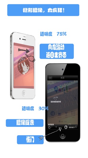 祝大家羊年快乐! 隐形摄像机,专业的偷拍利器,适合于非正常拍摄的各种场合: -博物馆中禁止拍摄,而您又不想错过分享的机会; -发现公车地铁的小偷,拍下他犯罪证据; -记者采访中的偷拍; -隐形的记录下别人的糗事; 隐形摄相机,让您在无形中完成这一切行动,别人只会看到您预设的屏幕,或是浏览网页,查看通讯录,甚至是黑屏拍摄。 功能介绍: 1、可供自由选择的隐形拍摄场景; 2、使用网页场景,在上网同时拍摄; 3、使用通讯录场景, 边查找联系人,边打电话发短信,边摄像; 4、使用黑屏场景,完全隐形拍摄,如同锁屏状态。 5、可以选择存储于应用内或者是系统相册; 6、强大的密码…
