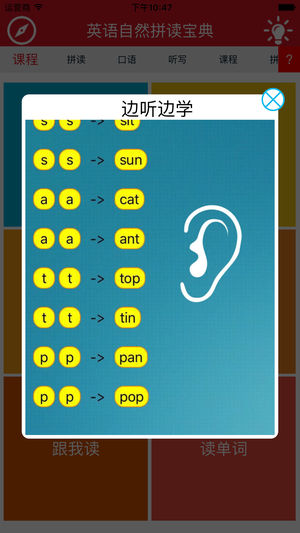 Appstore排名第一的英语拼读应用,是中小学学生学习国际上最流行的英语认读方法—自然拼读法(Phonics)的最佳应用, 由大学教授结合多年教育经验精心设计, 让广大学生无需参加昂贵的学习班, 就可以轻松掌握自然拼读法, 可以达到无需音标、无需死记硬背、见词能读、听音能写。 英语自然拼读宝典——把英语教学中的视、听、说紧密结合, 循序渐进地培养孩子的语音感知和运用能力。纯正发音领读, 让孩子从小感受地道英语发音, 从此孩子和枯燥的音标学习说bye-bye!, 本应用将成为孩子贴身的一对一家教辅导, 使一年级以上已经学习过中文拼音的学生只要稍加学习即可迅速学会, 帮助学生永久摆脱死记硬背英语…
