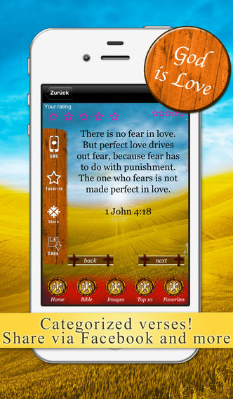 Find out how fulfilling and encouraging it is to read our bible verses each and every day! THE FEATURES: ✓ CAREFULLY SELECTED VARIETY Read the most encouraging and spiritual Bible verses! ✓ CATEGORIZED VERSES All verses are categorized by occasion & mood. Our app includes the following categories: ✿ In times of sadness and grief ✿ In times of anger and quarreling ✿ In times of stress or crises ✿ In times of restlessness ✿ To be forgiven and to forgive others ✿ When men fail you ✿ When people are unkind ✿ When you’re discouraged ✿ When you leave home or travel ✿ When you think of investments ✿ To have faith in God ✿ To be guided by God ✿ To be protected ✿ To remain honest ✿ For reassurance ✿ For security ✿ In danger ✿ In depression ✿ In doubt and many more PLUS ✿ Birthday verses ✿ Love verses ✿ Friendship verses ✿ Marriage verses and many more AND ✿ Inspirational verses for woman ✿ Inspirational verses for man ✿ Inspirational verses for children ✿ Blessings for babies ✓ SHARE Share inspirational Bible Verses via Twitter, Facebook & more - no need to cut and paste! ✓ SAVE & REVIEW Save your favorite verses for later reference ✓ TOP 10 Vote for the most important Bible Verses and check the current TOP 10: Read the other users’ favorite Verses! ✓ NAVIGATION No WIFI connection is necessary! Easy navigation, cute design! ✓ UNIVERSAL APP Automatically adapts to iPhone & iPad ✓ TWO MODES The app is optimized to run great in both portrait and landscape modes GOD BLESS YOU!