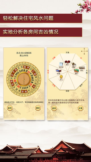 注:完整版无广告! App store最科技化的风水应用 风水实景罗盘为你详尽地讲解目前你的风水位置,让你更加了解你的前程未来。 采用2017年最新科技研发,利用精确的经纬度加上实景拍摄模拟,然后再专业地计算用户出生八字的开运方位,准确地计算出您的最佳开运位置。 风水实景罗盘特点: 1:科技与传统结合,全面祝你提升运气! 2:切合实际环境,为你实地分析风水! 3:摄像头功能,全方位分析辨别风水! 4:风水百科知识,助你成为风水达人 新功能介绍: [房间吉凶]:房间吉凶模式是解决住宅各房间布局风水上的问题。例如:大门向南,如果睡房在东方,受睡房影响主人会容易疲劳生病,对自己失去信息,需要使用这个功能调整睡房的风水,破除睡房的负面影响。 [流年方位]:流年方位模式是分析住宅中吉凶方位,调整流年风水影响。例如:今年东南方是文昌位,想要工作顺利,提升个人运势,就要调整东南方的风水。此外建议自建、改造住宅的朋友使用此功能去规划住宅。 [住宅平面图]:住宅平面图模式可以精准分析出住宅中每个位置的吉凶情况,想要生活美满就要善于利用住宅中的每个吉祥位置,该模式需要有一张住宅的平面图才能使用。 风水之学又叫堪舆之学,是我们中国流传下来的相地之术,中国风水学的形成由来已久源远流长,可以追溯到远古时代。风水的核心思想是人与大自然的和谐共存,了解自然环境,利用和改造自然,创造良好的居住环境。风水位置影响着一个人的身心状态,处在一个好的风水环境里,人的各种命理运程也会跟着改善。可是你知道一个人的生辰八字也会与他的环境风水有密切的联系么,不同命格的人适合不同的风水,好的风水都是相对其个人而言的。 当你的命格与你的风水现成相辅相成的最佳状态时,你不仅可以提升环境积极能量,还可以使人的思维清析,安神养性,保持和谐的精神状态。古代风水大师通过磁场感应,精心制作了风水罗盘来,给大家寻找最好的风水宝地,而如今时代发展,更加精细更加准确的罗盘诞生了,风水实景罗盘。 风水实景罗盘利用现在科技与传统风水理论相结合,通过不一般的方式来计算最适合你的风水位置。风水实景罗盘需要记录你的出生年月,然后与你的居家房子大门的所对位置纬度进行深入匹配,为你详尽地讲解目前你的风水位置。让你更加了解你的前程未来。