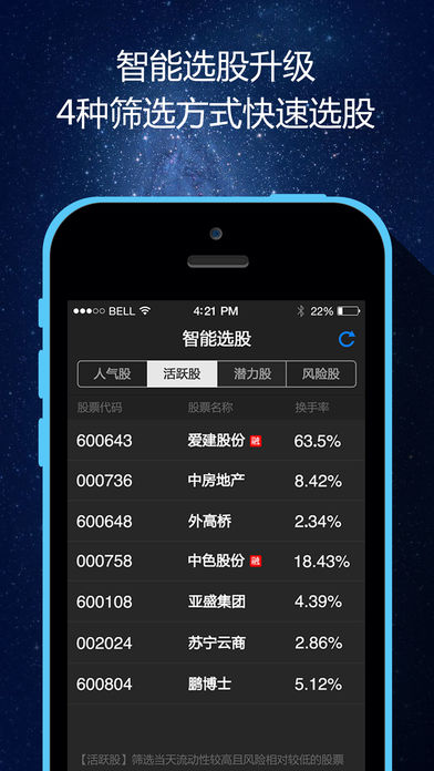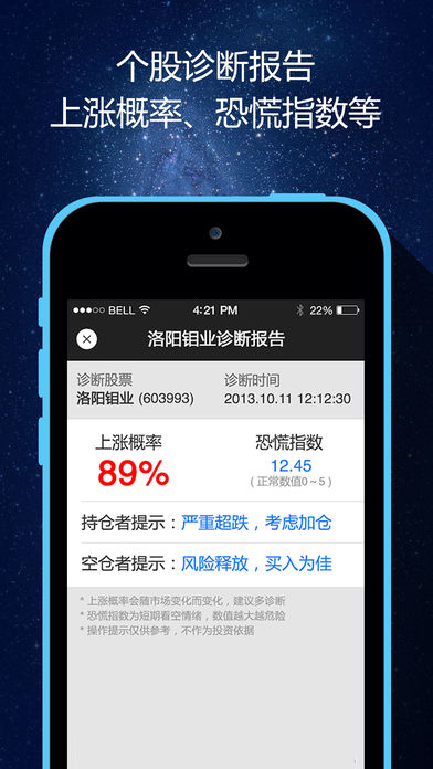 炒股不再是赌博!股票医生是一款股票量化投资软件,在你每次操作时提示当时的风险程度,帮助你控制风险,只需轻轻一点即可获取股票诊断报告。 【专业版和大众版的区别】 专业版用户将获得更多增值服务,并且是终生免费的 【特色功能】 1.股票诊断:个股上涨动力诊断报告 2.智能选股:快速筛选出活跃、人气、潜力和风险股 3.恐慌指数:短期看空情绪 4.操作提示:针对持仓和空仓投资者提供不同操作提示 5.财经日报:精选财经好文 声明: 股票医生不是预测软件,不推荐任何一只股票,所有诊断以当下的风险程度做出分析。股票医生是你身边风险的提醒者,风险高的时候提醒你谨慎,风险低的时候提醒你贪婪,从而大大提高投资的成功率 ------------------------------------------------ 【股票医生微信版同时发布,搜索“股票医生”即可】 广告及商务合作 QQ:231886190 官方网站:http://www.9pxdesign.com/stockdoctor/ 工作室网站:http://www.9pxdesign.com 官方微博:http://weibo.com/gupiao120/