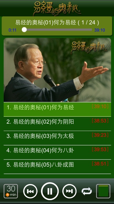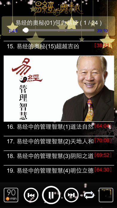 周易·易经的奥秘,有声3系列,曾仕强带您进入周易的智慧与奥秘, 【易经的奥秘】 【易经中的管理智慧】 【21世纪大易管理学】 SY Player,Innovation for You,技术创新点。 ▪自由编辑播放列表,上升、下降、喜欢、不喜欢 ▪强大的专辑管理功能。 ▪数十款风格(皮肤),选你喜欢 目录: 【易经的奥秘】 (01)何为易经 (02)何为阴阳 (03)何为太极 (04)何为八卦 (05)八卦成图 (06)易有三义 (07)善易不卜 (08)卦有何用 (09)解读乾卦 (10)解读坤卦 (11)乾坤人生 (12)破解命运 (13)易经与家庭 (14)卦的象数理 (15)超越吉凶 【易经中的管理智慧】 易经中的管理智慧(1)道法自然 易经中的管理智慧(2)天地人和 易经中的管理智慧(3)阴阳之道 易经中的管理智慧(4)明位立德 【21世纪大易管理学】 21世纪大易管理学(01) 21世纪大易管理学(02) 21世纪大易管理学(03) 21世纪大易管理学(04) 21世纪大易管理学(05) 21世纪大易管理学(06)