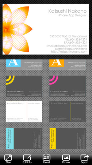现在你可以创建自己原来的名片,在您的iPhone或iPod touch!名片设计有很多的选择,以帮助你设计你的清凉卡! 选项 - 各种卡的大小 - 字体类型 - 使用为背景的照片 - 酷邮票 - 调色板 - 空气打印 - 通过电子邮件发送的PDF文件 - 保存你的名片给您的相册 - 酷预置