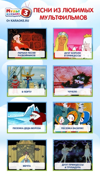 Детские песни, добрые мультфильмы – это Мультконцерт! • Работает без интернета. • Бесплатно! Установи приложение и порадуй ребёнка: • Для детей от 1 года; • Для тех, кому надо, чтобы ребенок поиграл сам; • Для развития ребёнка: возможность петь вместе с мультгероем – это не только слух и чувство ритма, но и море позитива; • Детское караоке. Подарите радость своему ребенку вместе с Мультконцертом: десять замечательных песен из мультиков – смотрите и пойте вместе с детьми: 1. В порту – мультфильм В порту 2. Дуэт короля и принцессы - мультфильм Бременские музыканты 3. Чучело - мультфильм Чучело-Мяучело 4. Ёлочка - мультфильм Новогодняя сказка 5. Мечта - мультфильм Летучий корабль 6. Первая песня разбойников - мультфильм Бременские музыканты 7. Песенка Василис - мультфильм Вовка в тридевятом царстве 8. Песенка Деда Мороза - мультфильм Дед Мороз и лето 9. Песня черного кота – мультфильм Голубой щенок 10. Дуэт принцессы и трубадура - мультфильм Бременские музыканты Не забудьте скачать и другие выпуски Мультконцерта!