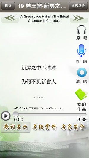 《越剧听唱》产品提供了100首由名家演唱的精彩的越剧名段,包含“原唱、伴奏、清唱、我的录音”等功能,便于模仿和欣赏名家的演唱;原唱、伴奏演唱时,歌词同步显示;我的录音,便于用户管理自己演唱的越剧唱段;产品还配有越剧简介、越剧文化、名家简介及名段曲目赏析;同时还增加了按需下载功能,方便用户选择所需的曲目。 《越剧听唱》产品,具体包含以下越剧名段。 汉文皇后•梦初醒 红楼梦•黛玉葬花 祥林嫂•听他一番辛酸话 盘妻索妻•洞房悄悄静幽幽 碧玉簪•三盖衣 浪荡子•十叹…