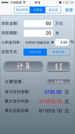 简介: 房贷计算器,是一个帮你计算房贷的小工具,比如:商业贷款,公积金贷款,组合贷款,税费计算 ... 主要功能: --- 全面地房贷计算功能 --- > 支持商业贷款 > 支持公积金贷款 > 支持商贷和公积金组合贷款 > 支持等额本息 > 支持等额本金 > 支持税费计算 --- 全面而权威的数据 --- > 支持最新的商贷利息数据 > 支持最新的公积金利息数据 --- 灵活自定义的的计算功能 --- > 支持自定义利息 > 支持商贷和公积金不同的贷款时间 > 支持自定义税费比例 > 支持月年计算,贴心 > 支持重置功能,快速 --- 简洁的界面风格 --- > 最精简突出重点数…