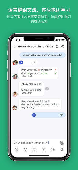 HelloTalk是全球第一个专为语言文化交换打造的移动社交社区。在HelloTalk中,你能找到全球任何一个语言的母语者和你一起学习。 功能亮点: —“配对”来自全球各地的语言伙伴 注册后,HelloTalk将根据你的母语和学习语言为你推荐和你学习需求相配对的用户。同时,你也可以按照自己的需求,根据母语、学习语言、语言等级,年龄、地域等选出理想语伴,即刻与他们无障碍沟通! —多样化的聊天形式 在HelloTalk中,你可以和语伴通过文字消息、语音消息进行交流,可拨打免费的网络语音电话、视频电话,还可互相分享有意思的图片、视频。 —强大的应用内辅助功能 无论是在聊天过程中,还是在使用“动…