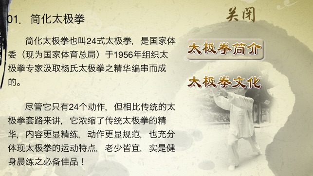 简化太极拳也叫24式太极拳,是国家体育总局于1956年组织太极拳专家汲取杨氏太极拳之精华编串而成的。共24个动作,它浓缩了传统太极拳的精华,内容精练,动作规范,重点突出,充分体现太极拳的运动特点,老少皆宜,实是健身晨练之必备佳品! 产品示范视频由国际武术裁判指导制作、动作精准;教学采用完整示范演练与分段讲解教学、要点提示相结合的方法,对每个动作要领进行详细的讲解示范;产品还配有太极拳分段讲解的文字说明,便于理解。 简化太极拳24式动作名称具体如下: 1. 起势 2. 左右野马分鬃 3. 白鹤亮翅…