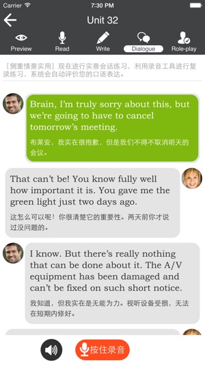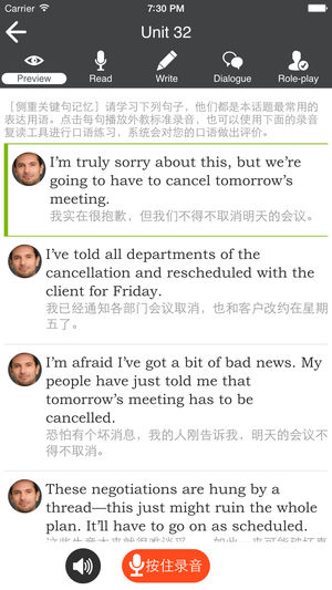 去高级法国餐厅吃饭,说法语实在是有点难为咱,可是你说英语问题不大吧!咱也想说中文,可是谁让英语是全球最广泛的英语呢!所以,赶紧储备这款APP吧。总有不时之需的。 ◆把你的手机变成超级英语学习机◆◆◆◆◆◆◆◆◆◆ 【听】:本课程配有外教原声全文朗读录音,即点即读,想听哪里听哪里,想听几遍听几遍,培养良好的英文语感。 【读】:您可以跟着外教一起读,外教读一句,您模仿一句,手机会将您朗读的句子录音并回放,逐字逐句纠正您的口语发音。 【说】:您可以和外教进行模拟实景会话练习,您选择一个角色来扮演,手机可以将您的虚拟会话录音并回放,提升您口语的实用能力。 【写】:根据外教录音,您将打乱单词顺…