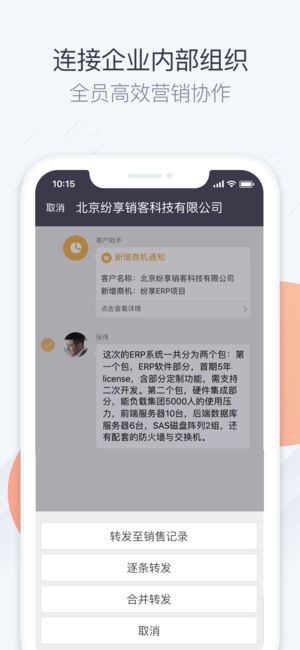 纷享销客-连接型CRM开创者 纷享销客是一款自主研发的移动销售管理SaaS应用,产品以“连接型CRM”为独特价值定位,助力企业构建组织内部的高效协作网络,重塑移动互联时代全新的客户关系、伙伴关系,实现效率提升和业绩增长。 纷享销客以移动CRM为核心,实现销售全流程与客户全生命周期的自动化、数字化管理; CRM+办公协同:以驱动业务为目标,连接企业内部组织和人,实现以客户为中心的全员高效营销协作; CRM+企业互联解决方案:连接上下游合作伙伴,实现企业间的业务协同和业务管理; CRM+微信:直连客户,实现企业与终端客户之间的零距离连接,提供高效敏捷的售后和会员服务; 以PaaS平台/开放平台为能…