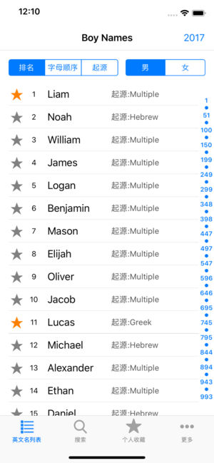 免费好用的英文名大全!数据来自美国权威机构最新统计,为您收集全美最受欢迎的新生儿名字。 本App默认提供2000个最受欢迎的男女名字,并附有丰富的英文原版解释;读音,名字来源,涵义以及最新排名等数据一应俱全。男女通用的名字也有明确注释。 升级到全功能版可以查看过去40年的全部排名数据,共5万多个名字。 同时还有收藏功能,您可以随时一键收藏中意的名字以供以后查看。也可以将名字列表通过邮件发送给自己或者朋友。 主要功能: * 男生及女生名字列表 * 可按受欢迎程度或者字母顺序查看 * 收藏夹及邮件功能 * 丰富解释:读音,名字来源,涵义以及最新排名及出生数据