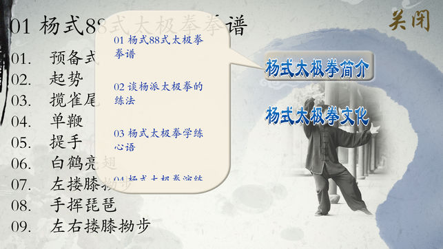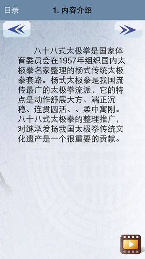 八十八式太极拳是1957年,国家体育部门组织一批太极拳专家整理出来的一套太极拳传统套路。它保留了杨式大架太极拳的基本结构风貌,具有中正自然,舒展大方,均匀连贯等特点。同时也规范了各地的一些不同练法。全套共88个动作,完整练习一遍,大约需要15分钟。 产品示范视频由著名太极拳名家李德印先生主讲,宗维洁女士分组示范。动作规范精准,教学方式直观有效,通过多层次演讲和讲解确保练习的准确性;教学采用对整套动作分段完整演练,分解教学和动作要点提示相结合的教学方式,使练习者直观领悟到太极拳法中手法、腿法等习练要领;产品还配有杨式太极拳相关简介和文化及八十八式太极拳拳式文字说明,便于理解。…