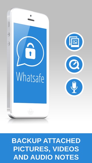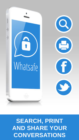Do you want to set a password and backup your conversations from WhatsApp? And what about searching, sharing and printing your messages and conversations? WHATSAFE is the solution you need! - Backup all your messages... Easy! - Password protected - Filter, search messages and customize your conversations - Share your conversations on Twitter, Facebook, Flickr, Evernote and Tumblr - Save the conversations as image in your device. READY TO PRINT! - Whatsafe works OFFLINE Get it NOW. Limited time SPECIAL PRICE! __________________________________ Disclaimer: Unofficial Product. This application is the sole creation and responsibility of the developer. This application is not endorsed by or affiliated with WhatsApp Inc. WhatsApp Messenger, its name, trademark, and other aspects of the app are trademarked and owned by their respective owners. If you believe that there has been a contravention of your proprietary rights, please email details to: support@whatsafe.com