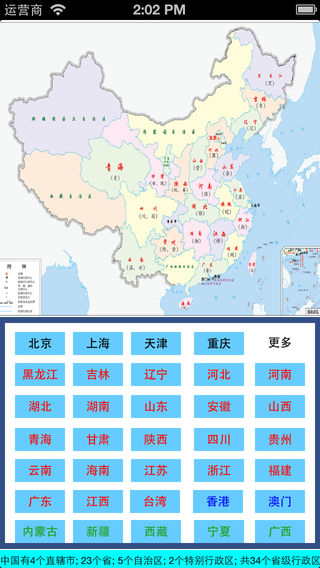 中国位于亚洲大陆的东部、太平洋西岸,陆地面积约960万平方公里。中国领土北起漠河以北的黑龙江江心(北纬53°30′),南到南沙群岛南端的曾母暗沙(北纬4°),跨纬度49度多;东起黑龙江与乌苏里江汇合处(东经135°05′),西到帕米尔高原(东经73°40′),跨经度60多度。从南到北,从东到西,距离都在5000公里以上。中国陆地边界长达2.28万公里,大陆海岸线长约1.8万公里,海域面积473万平方公里。 中国有23个省 5个自治区 4个直辖市 2个特别行政区 共34个省级行政区 23个省:从北向南,黑龙江省(黑)、吉林省(吉)辽宁省(辽),河北省(冀)、河南省(豫)、山东省(鲁)、山西省(晋),陕西省(陕、秦)、甘肃省(甘、陇) 、青海省(青),四川省(川、蜀) 、云南省(滇、云) 、贵州省(黔、贵) ,湖南省(湘)、湖北省(鄂) 、江苏省(苏)、 江西省(赣)、安徽省(皖) 、浙江省(浙)、广东省(粤)、福建省(闽), 外加海南省(琼)、台湾省(台) 4个直辖市: 北京市、天津市、上海市、重庆市 5个自治区 :广西壮族自治区、内蒙古自治区、西藏自治区、宁夏回族自治区、新疆维吾尔自治区 2个特别行政区:香港特别行政区、澳门特别行政区 中华大地应用软件详细介绍我国辽阔地域,各省市区介绍,旅游,历史,地理,经济,文化,是了解中华人民共和国最好的应用之一.