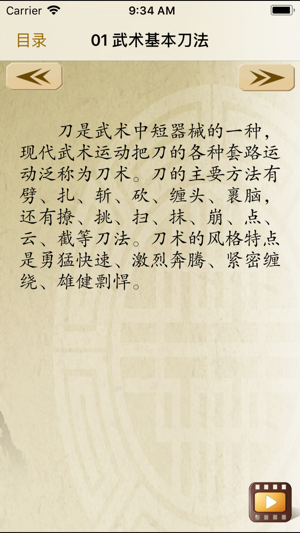 刀是武术中短器械的一种,现代武术运动把刀的各种套路运动泛称为刀术。刀的主要方法有劈、扎、斩、砍、缠头、裹脑,还有撩、挑、扫、抹、崩、点、云、截等刀法。刀术的风格特点是勇猛快速、激烈奔腾、紧密缠绕、雄健剽悍。 产品示范教学视频简要介绍了武术基本刀法及初级刀讲解教学(全套正面演练、四段动作分解教学、全套背面演练)。并配有“初级刀”相关介绍(初级刀动作名称、刀的简介、主要刀法、古代名刀、武侠中的刀等)及功法讲解的文字说明,便于理解。 《初级刀》示范视频具体包含以下内容。 01 武术基本刀法 02 全套正面演练…