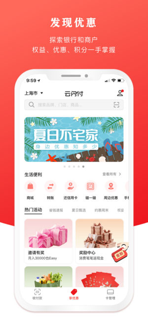云闪付APP,银行业统一移动支付战略产品,银行卡管理一步到位,银行卡优惠一网打尽。 【主要功能】 1.全面的银联银行优惠权益查询,实时更新省钱省心。 2.手机扫码支付,银联金融级安全保护,资金安全无忧。 3.绑定银联卡,享受消费提醒、交易查询、手工记账服务。 4.信用卡还款,手机充值,公共缴费,转账,收款一站搞定。 5.在线办卡,尊享一元停车、出行贵宾厅服务等银联权益。 【官方网站】https://www.95516.com/ 【官方微博】云闪付 【官方微信】Yinlian_KY