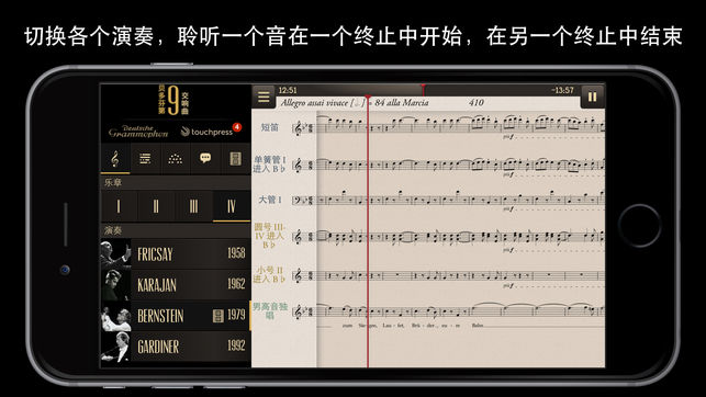贝多芬第9交响曲呈现德意志唱片公司四个传奇录音版本。通过一个卓越的应用,使您前所未有地领悟这一标志性作品。 贝多芬第9交响曲特色功能包括: 比较四次演出:四次录音跨越50年,任何时刻,轻轻一触即可切换 – 聆听一个音符开始在一个十年,结束在另一个十年。 发现“节拍地图”:突破性的演出视觉化,显示了音乐进行中乐团不同部分的脉冲。 探索音乐:贝多芬第9交响曲带您倘佯在贝多芬的晚期杰作中 – 跟随乐谱或1825年的手稿,精确与音乐同步。 iPad可用的额外精彩功能: 专家加盟:观看超过90分钟专门摄制的音乐家,作曲家和伟大的指挥家,包括约翰•艾略特•加德纳,古斯塔沃•杜达梅尔和柏林爱乐…