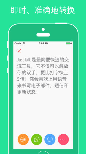 Just Talk 是一款简单而强大的语音转文字应用,可用于将语音迅速转换成文字。 :: :: 主要功能:: :: - 把您的话翻译为40种语言。 - 直接从应用发送电子邮件、文本和 WhatsApp 消息。 - 发布微博。 - 复制文本供在其他应用中使用。 - 漂亮而简约的设计 :: :: 支持的语言 :: :: - 阿拉伯语 - 捷克语 - 丹麦语 - 英语 (英国) - 英语 (美国) - 英语 (澳大利亚) - 中文 - 中文(繁体) - 中文 (香港) - 日语 - 韩语 - 法语 (法国) - 法语 (加拿大) - 荷兰语 (荷兰) - 芬兰语 - 德语 - 希腊语…