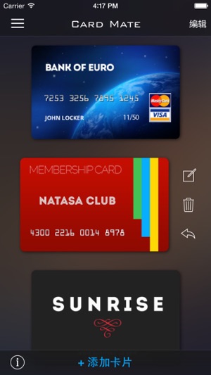 卡片太多,钱包太鼓?每天出门不知道钱包里该带哪些卡片?需要使用某张卡片时,打开钱包却发现没带?需要使用信用卡时,由于记不住卡号和有效日期而烦恼?钱包装了太多卡片,担心钱包丢失而失去所有卡片? 没有问题,立刻还击!今天就安装卡片管家,让卡片管家自动扫描每一张卡片的正面和背面图片,再为卡片添加上必要的名称和信息备注。无论您有多少卡片(身份证、社保卡、居住证、会员卡、银行卡、信用卡...),只要拥有了卡片管家,就可以轻松地管理和愉快地使用您所有的卡片,从此钱包再也不用满满地装着所有卡片,从此让卡片管家为您随时随地呈现每一张卡片的所有信息。 卡片管家支持卡片分类,您可以添加、删除、编辑、自定义…