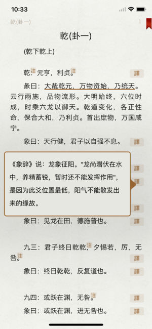 有声同步书系列之《易经》,可听可看的经典,名师朗读,字幕同步,调节语速,包含注释,译文,题解等。 支持点查,一书多用,老少皆宜。 主要功能: *点击“注”标记,查看注释 *点击“译”标记,查看分段译文 *双击句子,从指定位置开始播放 *点击工具条“问号”按钮,查看赏析,译文等 *可关闭标注的显示 *长按文字后,可块选文字,查询内置字典,或通过Google,维基百科查询 *高亮文字 *书签功能 *简繁切换 《易经》简介: 《易经》也称《周易》或《易》,是中国传统思想文化中自然哲学与伦理实践的根源,对中国文化产生了巨大的影响。据说是由伏羲氏与周文王(姬昌)根据《河图》…