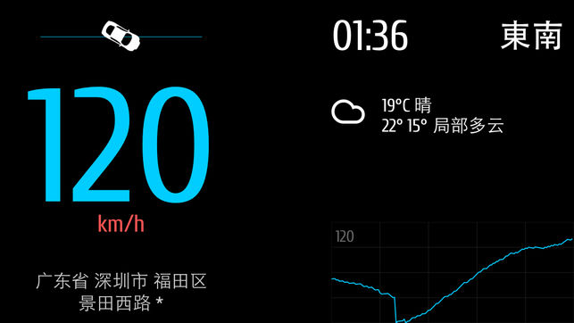 - 直观显示当前车速、行使方向、速度曲线、当前地理位置、当地天气情况 - HUD(Head Up Display) 类似BMW的车窗投影模式,可以将行车信息投影到前挡风玻璃上 - 美观的图形化界面,支持横竖屏模式 - 丰富的设置选项 - 多国语言支持